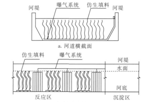 該工程利用河床空間建設, 前段為反應區, 后段為沉淀區。反應區主要由仿生填料和微孔曝氣系統組成, 建設完成后向反應區內投加高效人工菌, 起到強化處理效果的作用。仿生填料是一種帶狀柔性填料, 密度小, 安裝便捷, 只需將其一端固定于河道底部, 另一端就可在浮力作用下像水草般漂浮于水中。曝氣管與仿生填料在河道底部間隔鋪設, 具體結構見圖